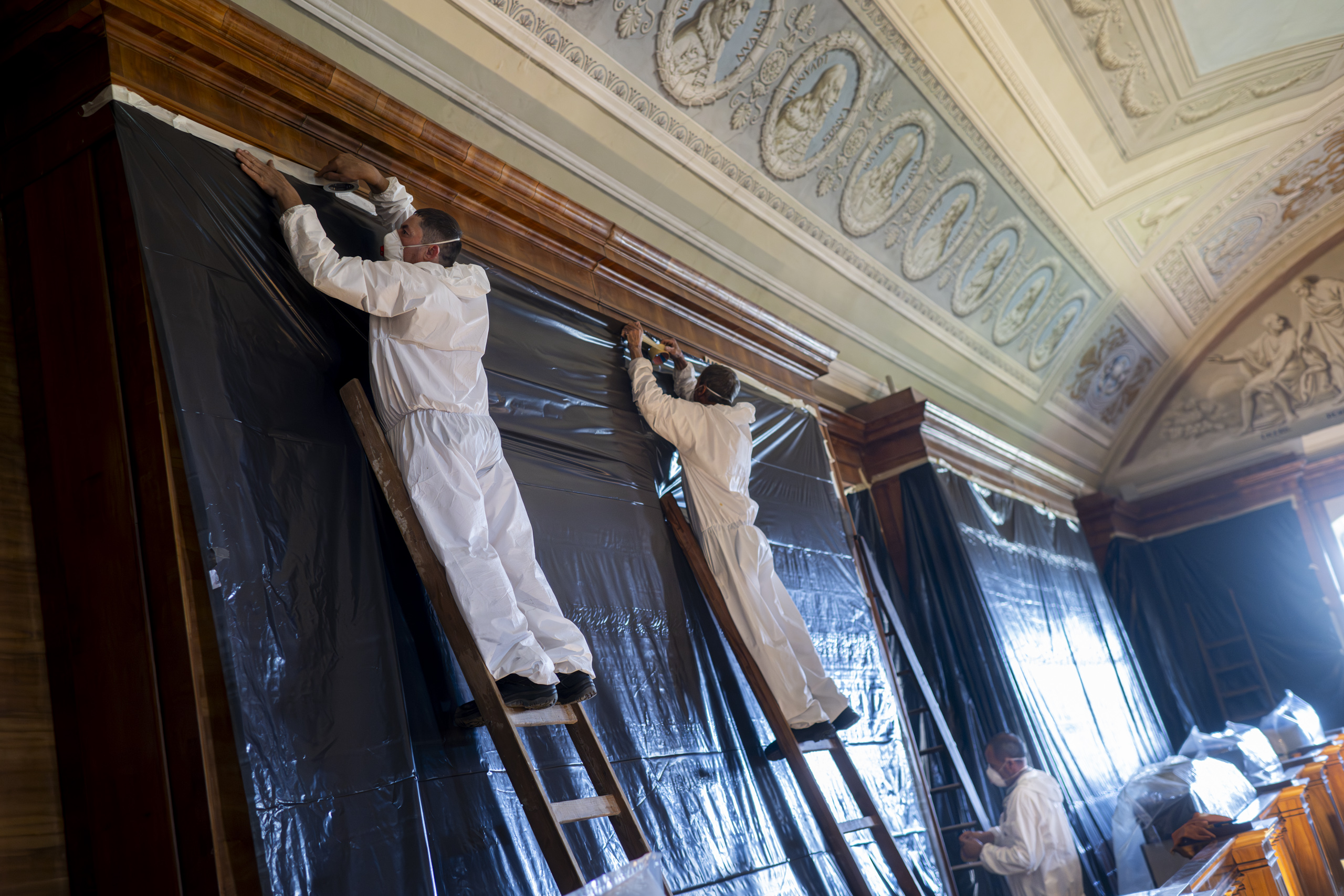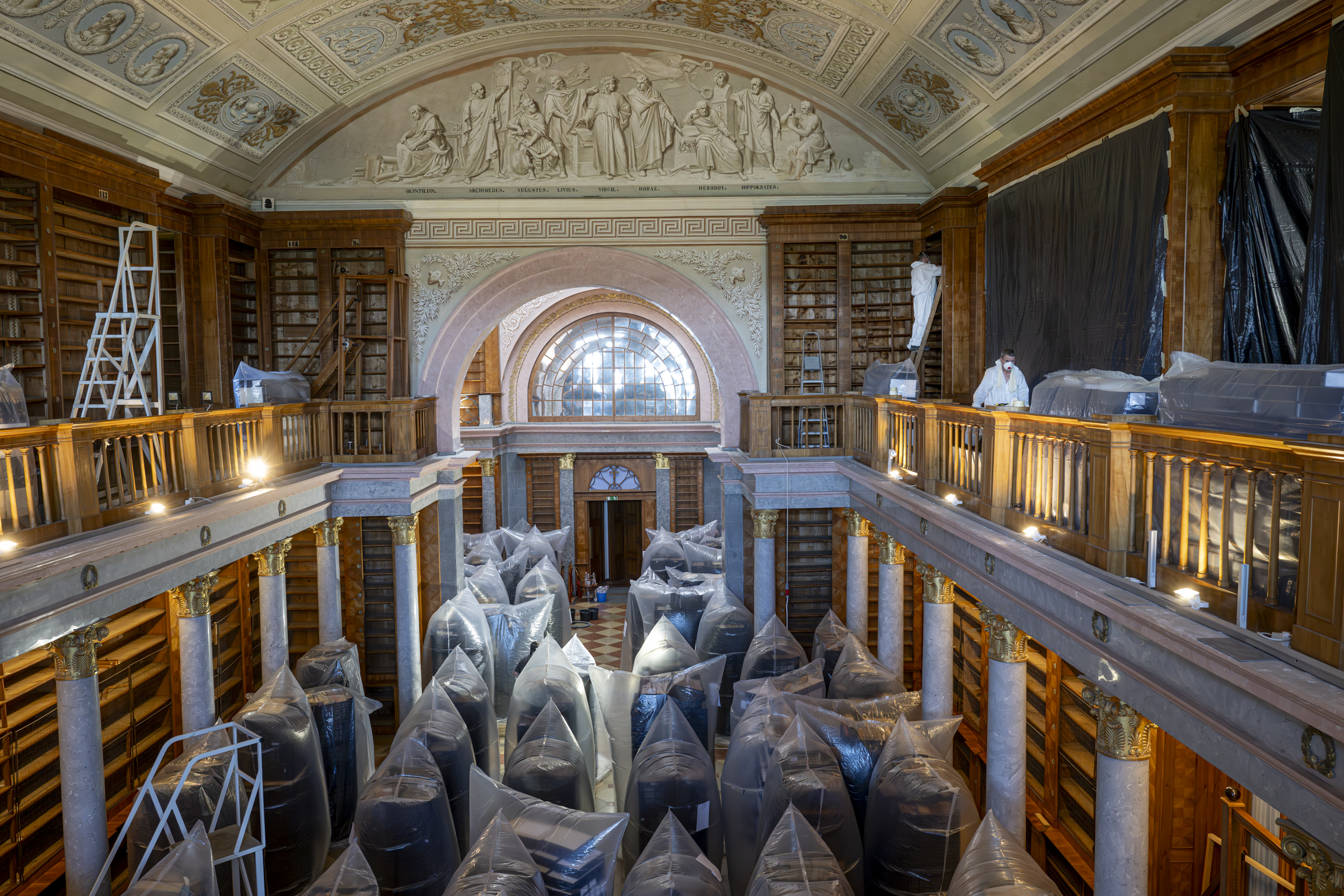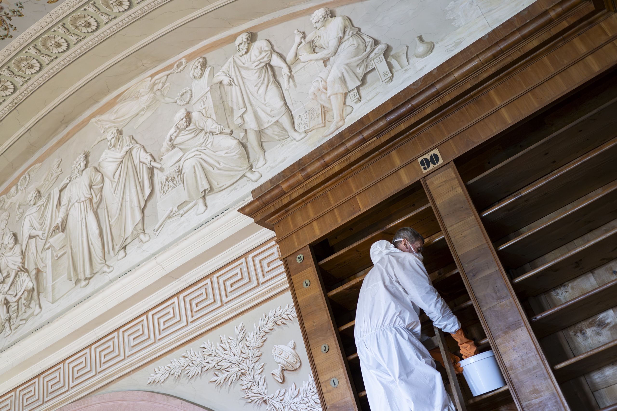 A felületeket négyzetcentiméterről négyzetcentiméterre kenték le kétféle – megelőző és fertőzéseket megszüntető – hatóanyagot tartalmazó védőszerrel. Nagyon pontosan kiszámolt vegyszer mennyiségeket kellett felhordani a felületekre. A történelmi helyszín adottságai miatt a munka különösen nehéz volt. Eleve fokozottan ügyelni kellett az óriás nejlon buborékokba csomagolt könyvekre. A polcok jó része karzatról, létráról elérhető csak, ami tovább nehezítette a munkát. A kétszáz éves bútorok felületkezelése, lakkozása különösen érzékeny az oldószerekre – itt nem lehet hibázni.