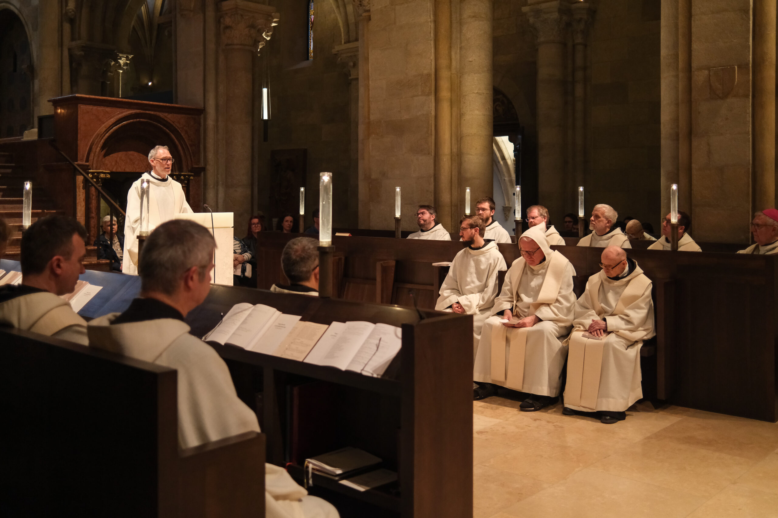 Ahogy az utolsó vacsora előtt Jézus megmosta a tanítványok lábát, példáját követve a nagycsütörtöki szentmisében Cirill főapát mosta meg szerzetestársaiét. A liturgia végén pedig szintén ő végezte el az oltárfosztás szertartását. Minden díszt eltávolított az oltárról jelképezve Jézus elfogását és elhurcolását. A szentmisén igehirdetésében Konrád atya is erre a gesztusra irányította a figyelmet. A következőkben a 2026. április 2-án, Nagycsütörtökön elhangzó homíliáját teljes egészében közöljük.