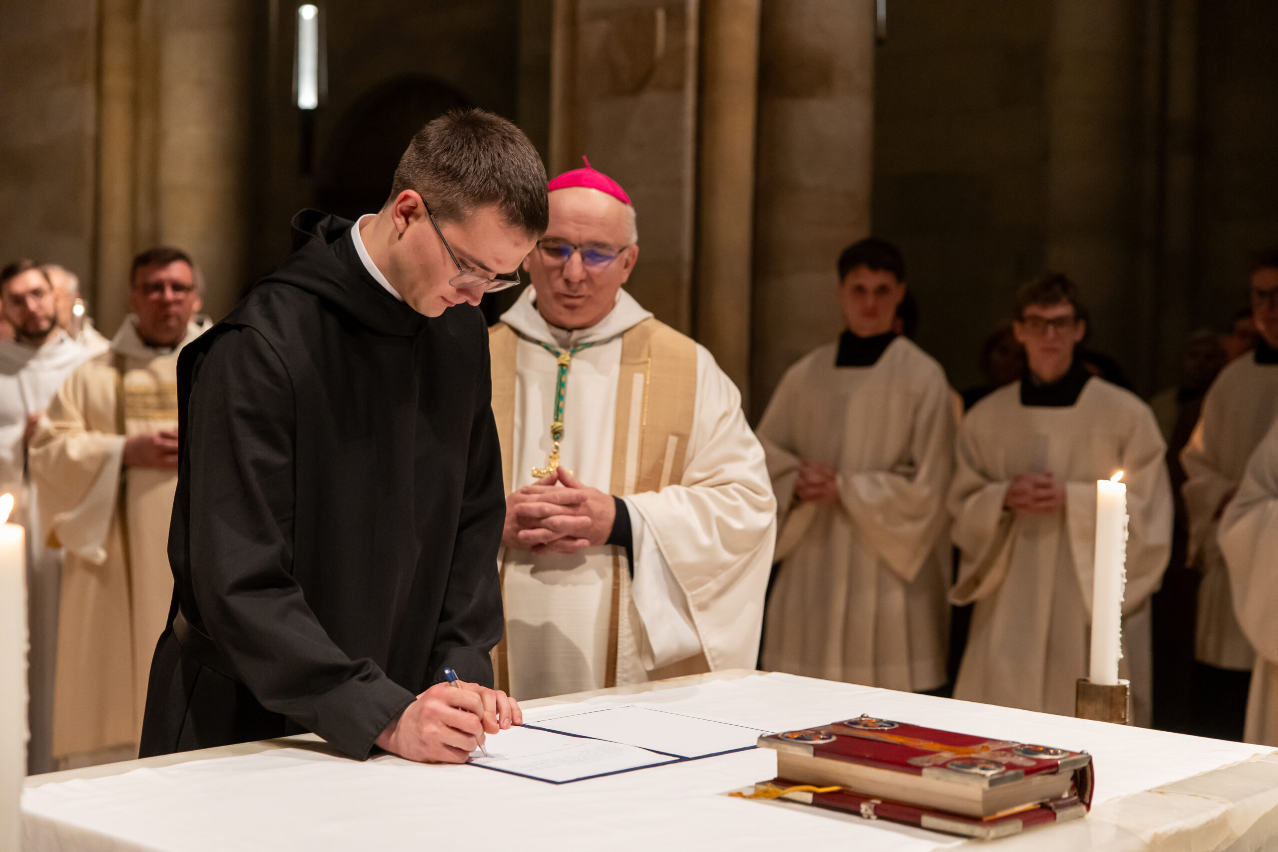 A homília után – miközben Brúnó testvér az oltár mögött leborulva feküdt – a közösség az általa választott szentek közbenjárását kérte. A Mindenszentek litániáját követően a szerzetes felolvasta a fogadalmát, majd azt Cirill atyával együtt aláírta.