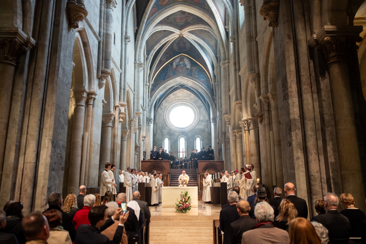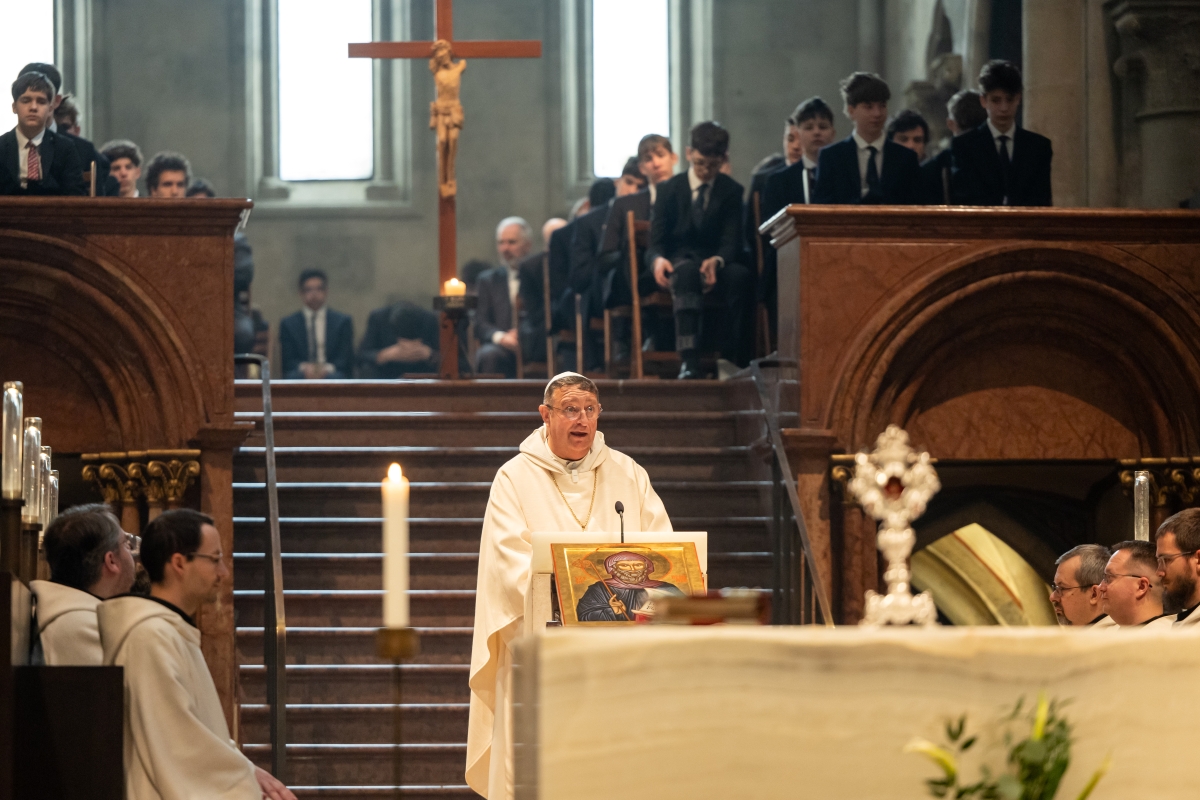 A liturgia elején Hortobágyi T. Cirill főapát Szent Pál szavaival köszöntötte az egybegyűlteket: „Törekedjetek arra, hogy a béke kötelékében fenntartsátok a lelki egységet.” Mint mondta, ehhez az eszközöket is megadta az apostol, ezek: az alázat, a szelídség és a türelem. Szerinte Szent Pál üzenete egyben Szent Benedeké is, aminek különösen is van ereje Pannonhalmán, a Szent Márton-bazilikában.