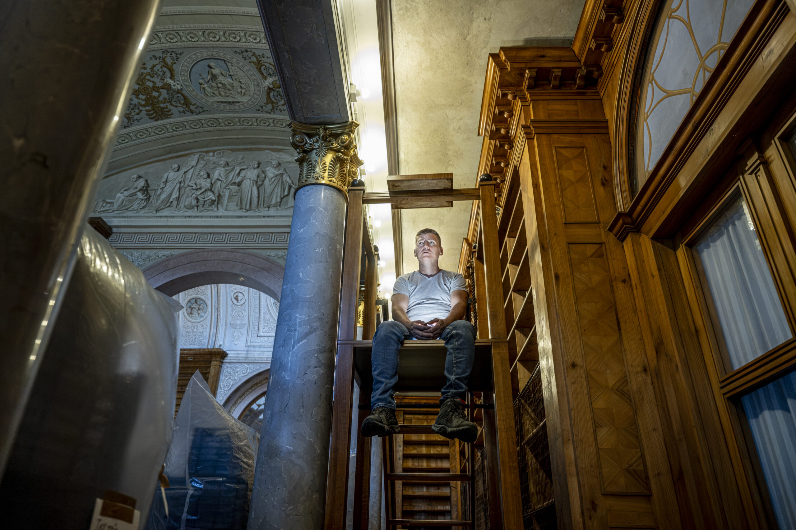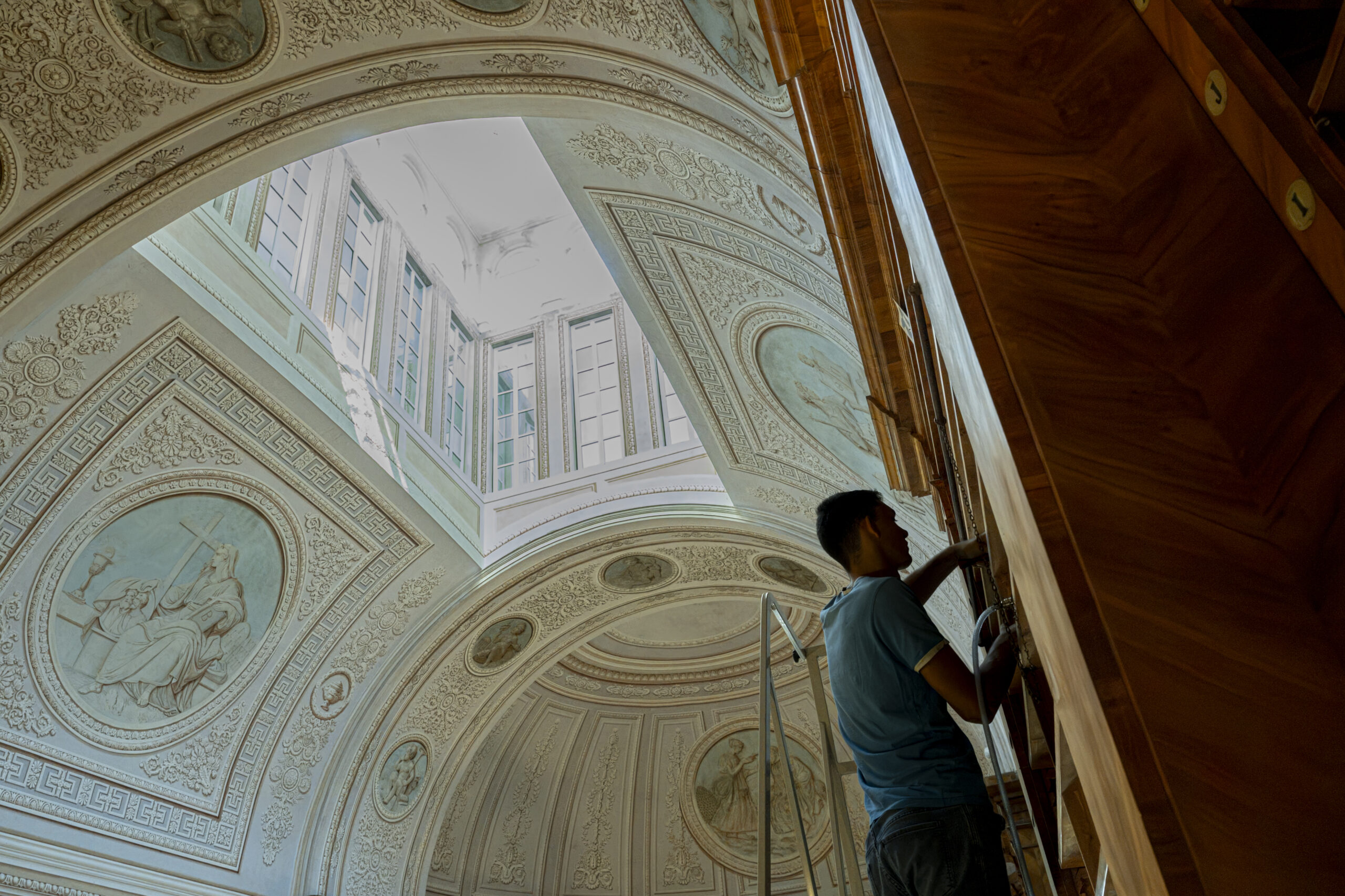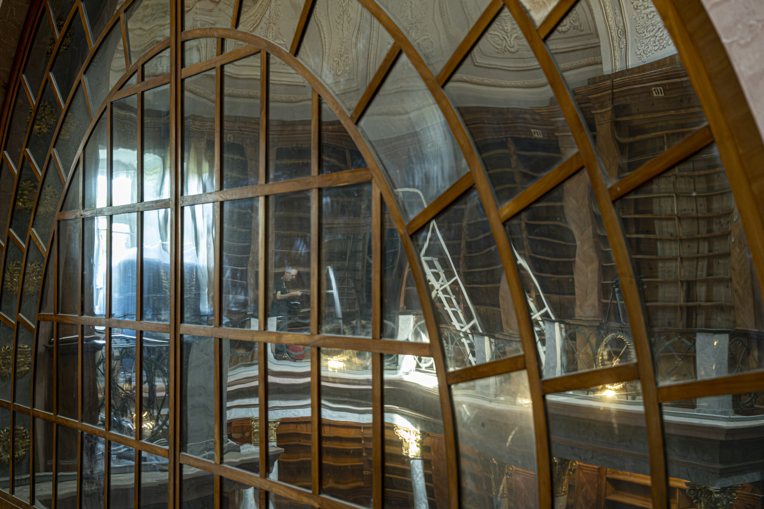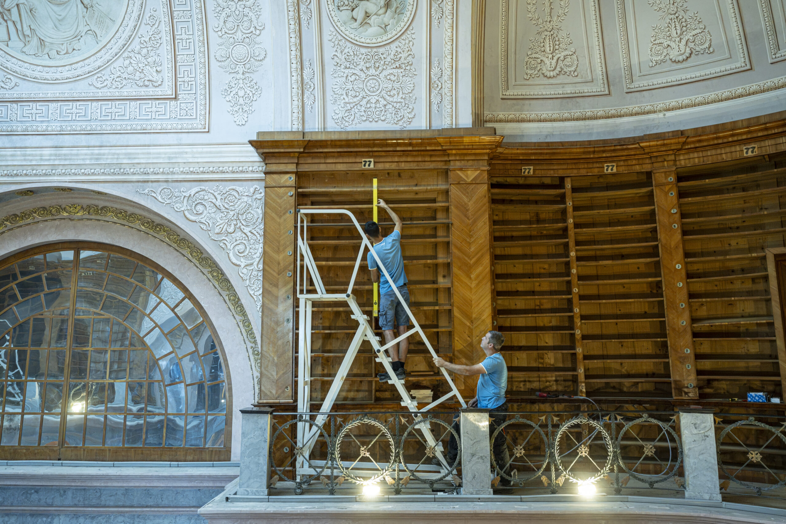 Az évek alatt kialakult bizalom hasznosult akkor is, amikor néhány hónapja a könyvtár rovarmentesítési munkálatai közben ismét megkeresték őket. A könyvek lepakolásakor szembesültek ugyanis azzal, hogy az eltelt két évszázad erősen nyomot hagyott a polcokon – szinte mindegyik meghajolt, elvetemedett. Itt az idő kijavítani, nosza elő a tervrajzokkal! Ám amíg az épület szerkezetéről maradtak fenn eredeti tervek, a belsőépítészeti megoldásokról, a polcrendszerről szinte semmi. Egy kiváló asztalosnak azonban ez nem akkora gond, mert akármilyen hihetetlenül is hangzik, a bútorzatépítési technológiák alig változtak. Eltelt kétszáz év, de a technika nincs annyira távol. Ránéznek, és látják, hogy polc-beakasztásos, fogasléces megoldásokat alkalmaztak, swartnitot és furnérozást, amiket manapság már nem pontosan így használnak, de tisztában vannak a kivitelezésével.
