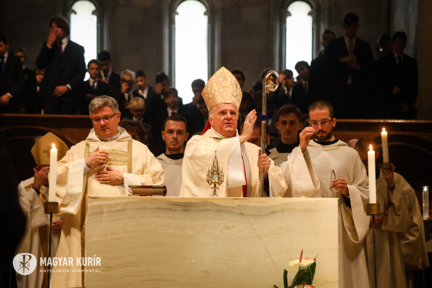 Az ünneplőket – a közélet jeles képviselőit, pap- és szerzetestestvéreket, a bencés gimnázium tanárait, diákságát – Hortobágyi Cirill főapát köszöntötte. A falakon a krizmával való felszentelés, kereszttel jelölt helyén „12 gyertya ég a bazilikában, Szent Márton templomában. A 12 születésnapi fény emlékeztet, hogy ez a templom a 12 apostolra és a szerzetespüspökre épült, és arra, hogy példájukra mi is az Úrnak és testvéreinknek adjuk életünket.”