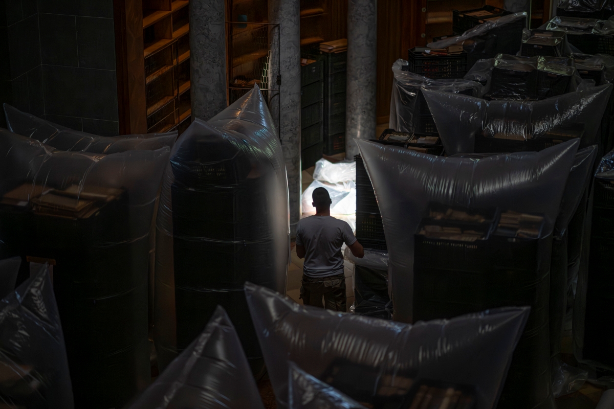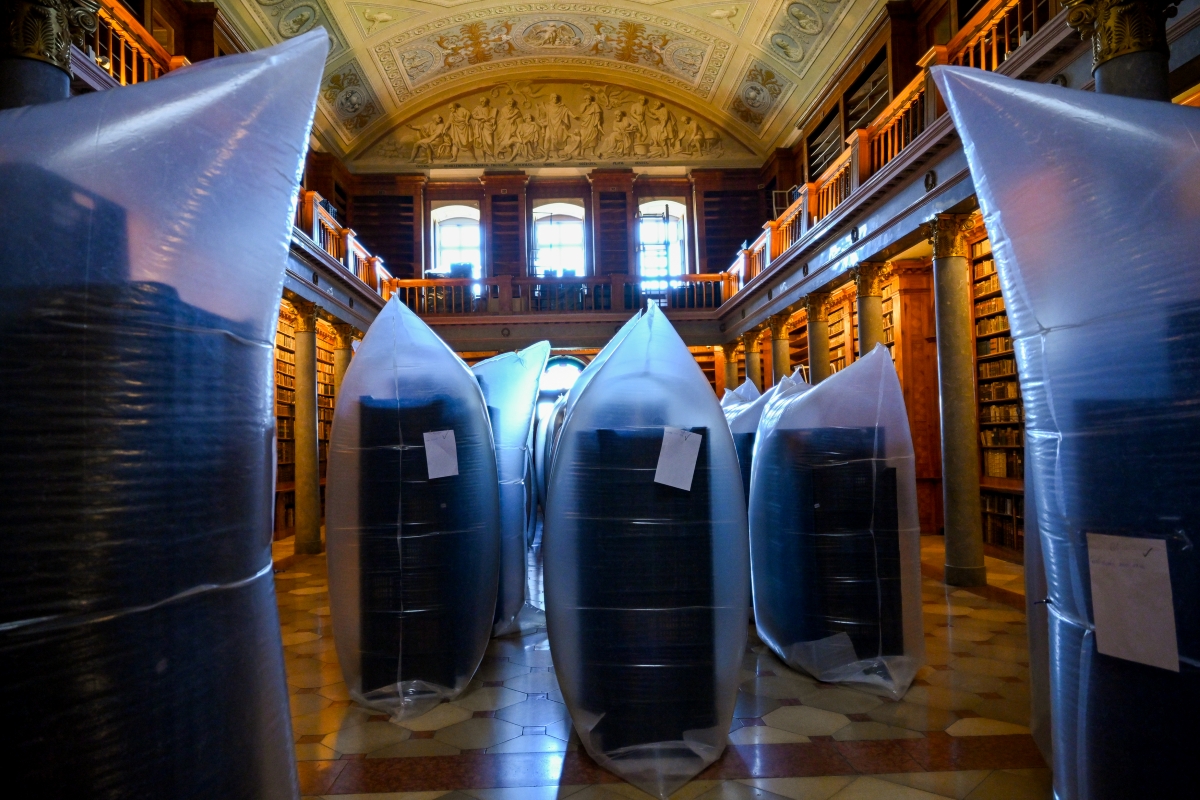 Még augusztus folyamán, miután az összes kötetet becsomagolták, egy újabb szakembergárda nekiállt a polcok fertőtlenítésének. Biocid anyaggal lekenték az összes fafelületet, takarófóliával fedték el, majd ki kellett várni a szellőzési, párolgási időt. Ezután érkeztek az écsi asztalosok, hogy alátámasztásokkal megerősítsék a kétszáz éves polcokat.