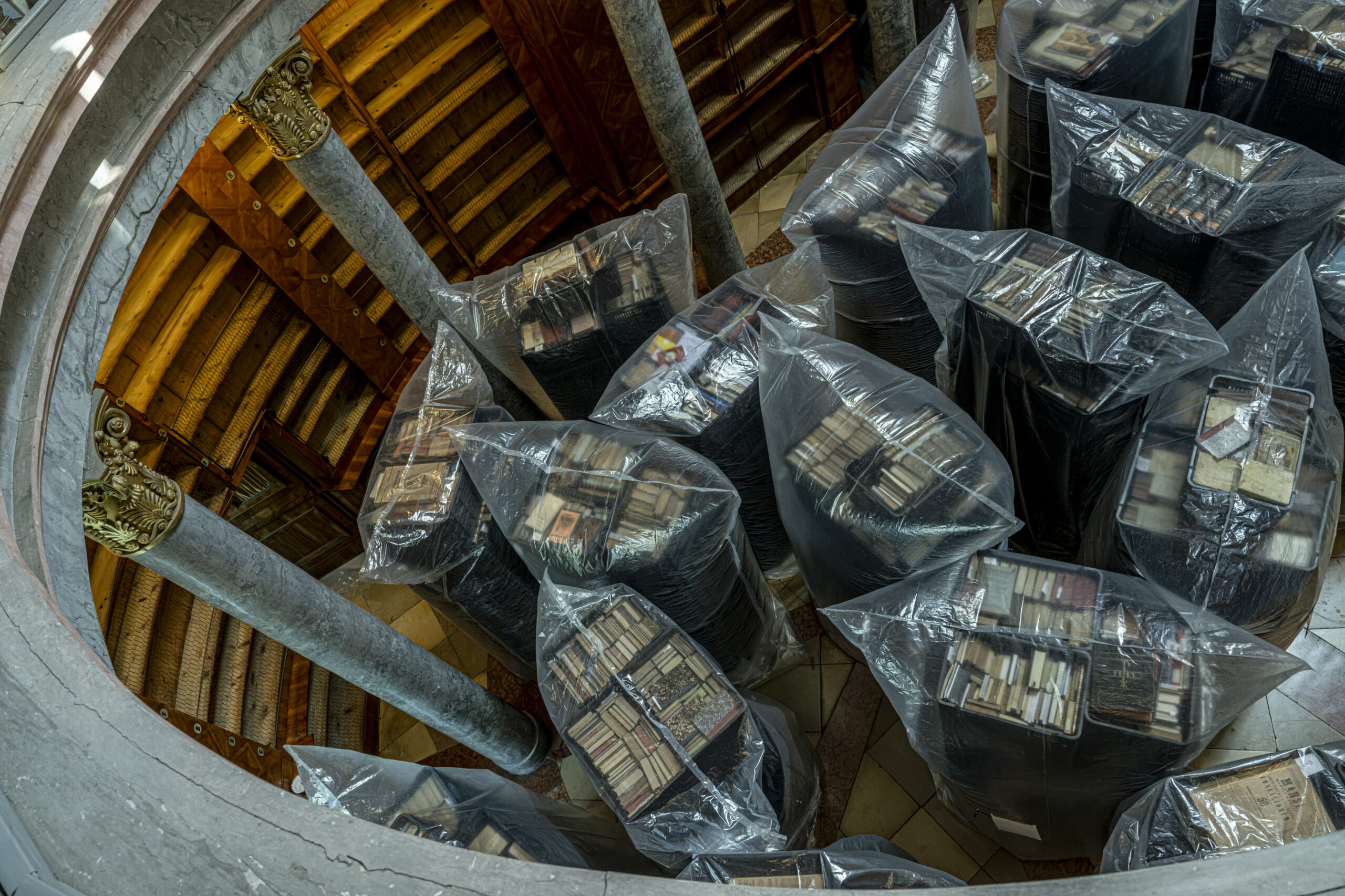 A munka egyik leglátványosabb, egyben legösszetettebb része a könyvállomány teljes lepakolása és rovarmentesítése volt. A nyár folyamán a mintegy 100 ezer kötetet háromezer ládába csomagolták, majd hatalmas fóliazsákokba zárták, és anoxiás – oxigénmentes – környezet kialakításával hat héten át kezelték. A visszafertőződés kizárására a polcokat előbb teljesen fertőtlenítették, mielőtt a csomagokat felbontották. Másfél hónapig mind az 1800 polc üresen állt.