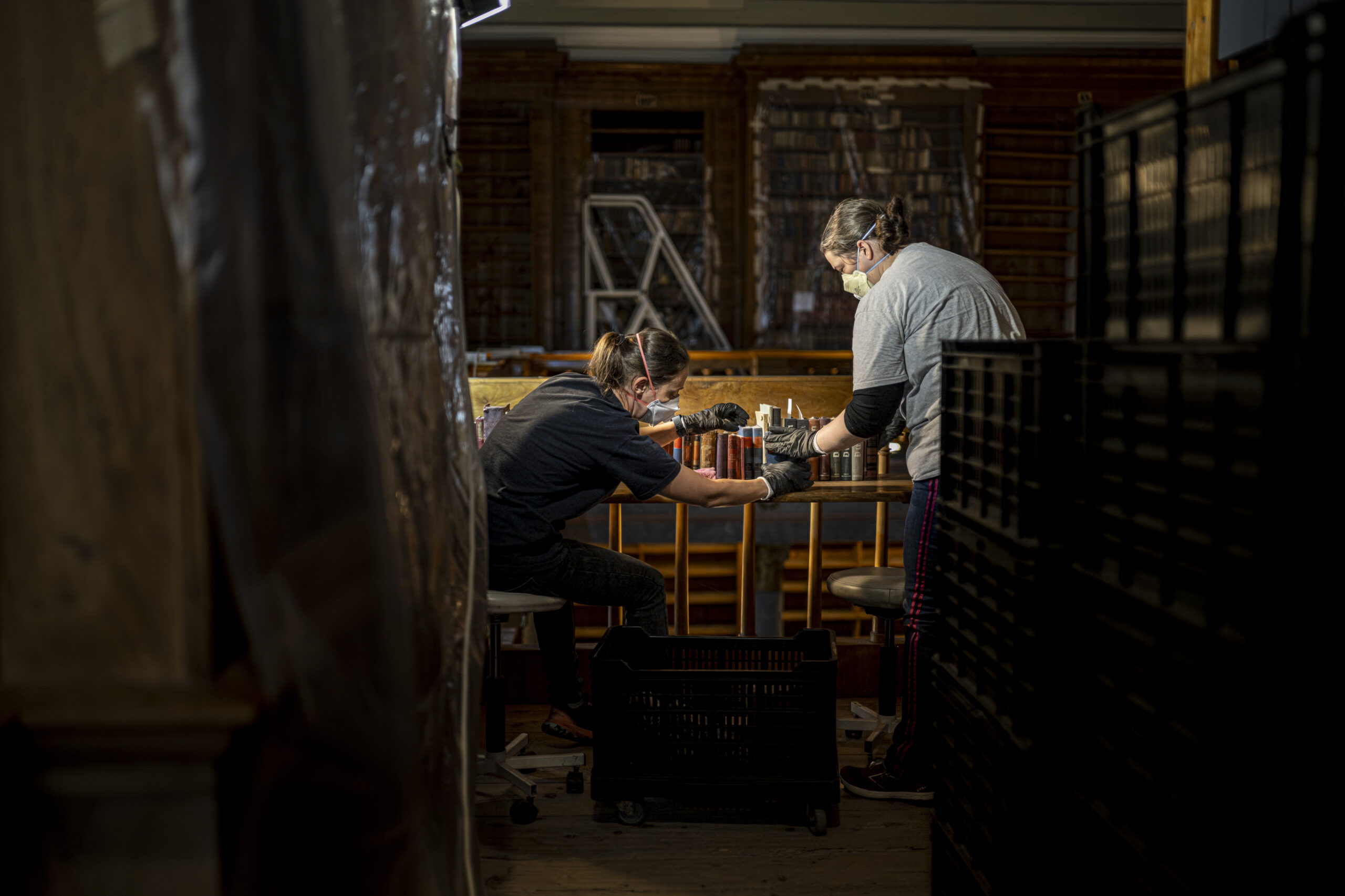 Míg ezek készültek addig a Főapátság takarító csapata alaposan megtisztította a bútorzatot a lerakódott portól, szennyeződésektől, hogy egy újabb szakembergárda nekiállhasson a polcok fertőtlenítésének. 1600 négyzetméter felületet kezeltek le oldószeres, biocid tartalmú faanyagvédőszerrel. Ez nemcsak megszüntette a meglévő fertőzéseket, hanem évtizedes védelmet is nyújt a károsító hatások – gomba, penész, bogár – ellen.